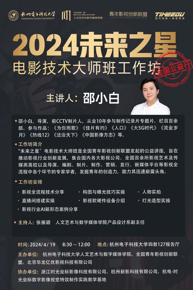 “未来之星”电影技术大师班是全国青年影视创新联盟发起的公益讲座,旨在推动影视行业创新发展,集合国内各大影视公司、全国百余所影视艺术及传媒类高校以及导演、编剧、制片、制作、营销、发行、新媒体平台等影视全流程中各个环节的专家学者,发掘青年的创造力,助力其迅速崭露头角。