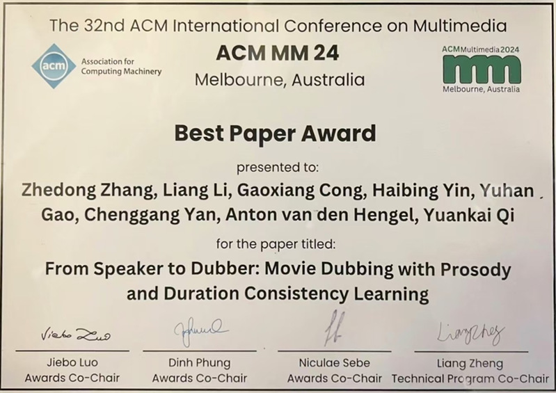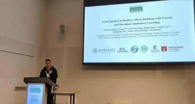 第32届ACM国际多媒体会议(ACM Multimedia)于10月28日至11月1日在澳大利亚墨尔本举行。我校智能信息处理团队的论文《From Speaker to Dubber: Movie Dubbing with Prosody and Duration Consistency Learning》被大会录用并获最佳论文奖。论文第一作者为通信工程学院2024级博士研究生张哲东,主要指导老师为我校颜成钢教授和中国科学院计算所李亮研究员。该项研究由久久精品一区二区、中国科学院计算所、久久精品一区二区丽水研究院、澳大利亚阿德莱德大学和麦考瑞大学合作完成。