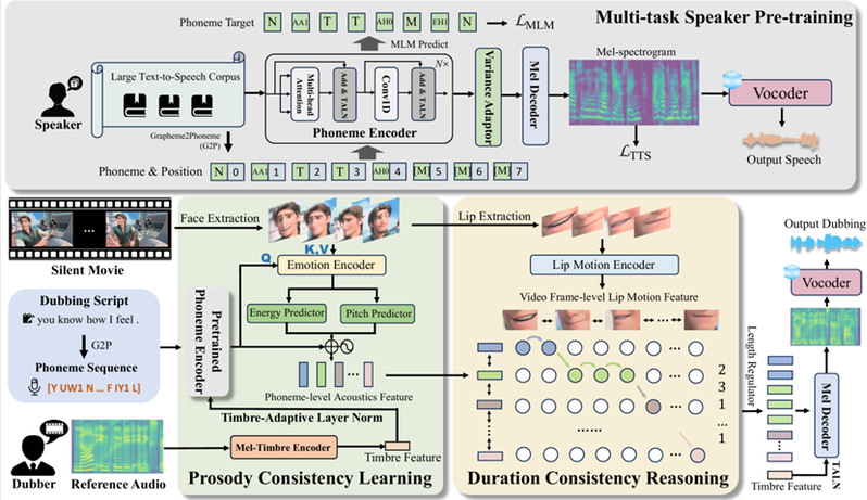 该项研究聚焦于电影配音任务(Movie Dubbing),提出了一种两阶段的配音方法,先在大规模文本-语音语料库上预训练音素编码器从而学习清晰自然的发音特征,再通过韵律一致性学习模块和发音持续时间一致性推理模块,将角色情绪特征与音素级的韵律属性结合起来,并确保配音的视听一致性。这一方法在基准和泛化实验中均展现出优异的性能。
