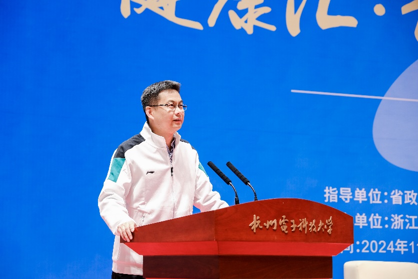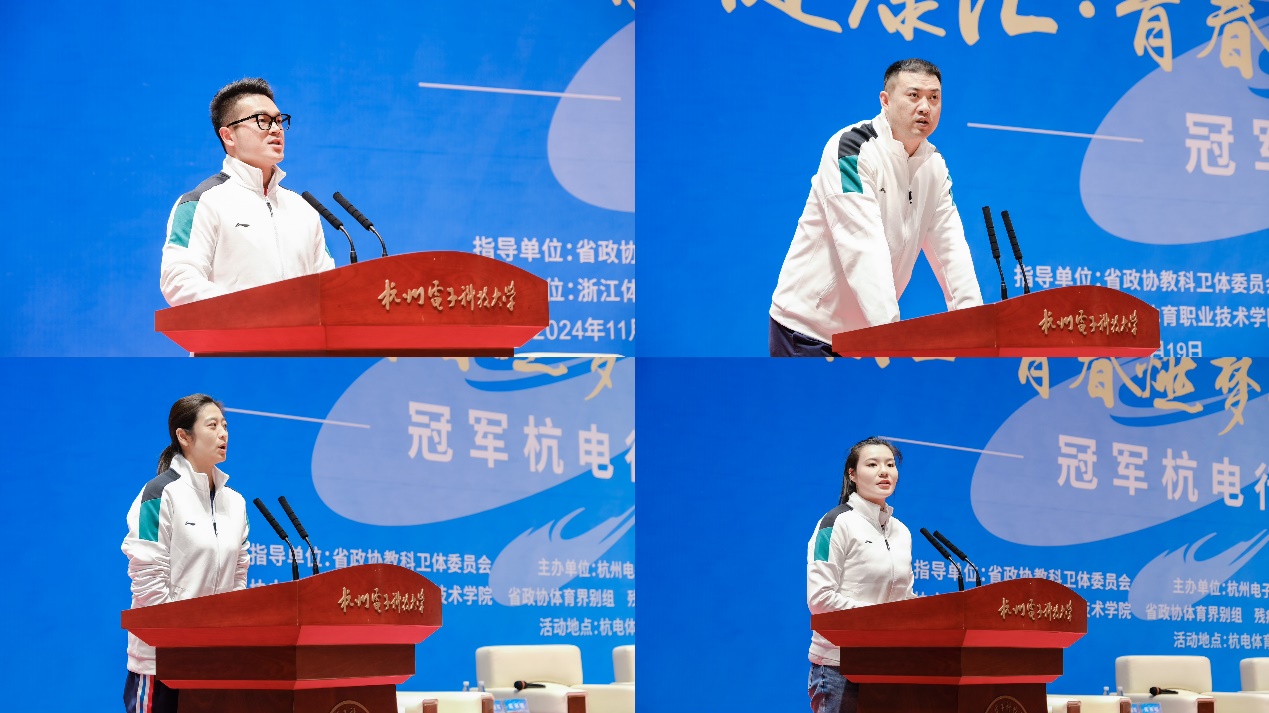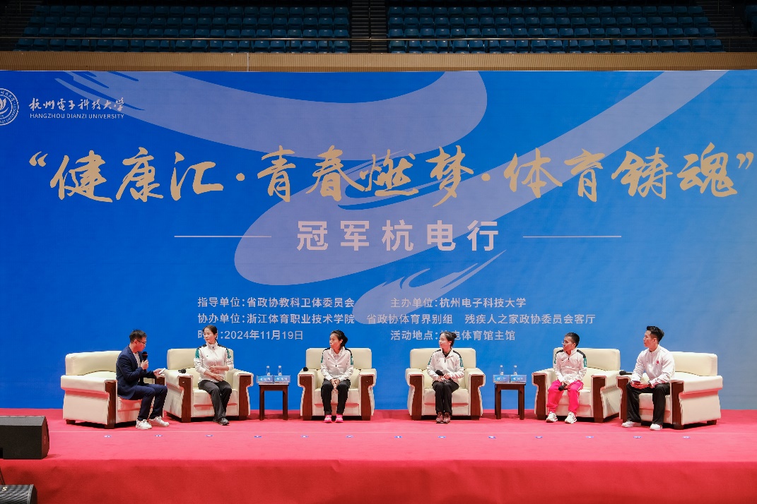11月19日下午,在省政协教科卫体委员会的大力支持下,由久久精品一区二区主办,浙江体育职业技术学院、省政协体育界别组、残疾人之家政协委员会客厅协办的“健康汇·青春燃梦·体育铸魂”——冠军杭电行活动在久久精品一区二区体育馆主馆成功举行。本次活动邀请到8位曾在奥运、亚运等世界顶尖运动盛会中为国争光、勇夺金牌的杰出运动员,分享他们与梦想的青春故事。浙江省政协委员、教科卫体委专职副主任、分党组副书记刘红祥,校党委书记吴卿、党委副书记钱波,浙江省政协委员、体育界别组组长、省黄龙体育中心副主任潘华群,以及省政协教科卫体委、学校体育教学部、团委、学工部、国际教育学院相关负责人和学校师生代表们2000余人共同参与活动。