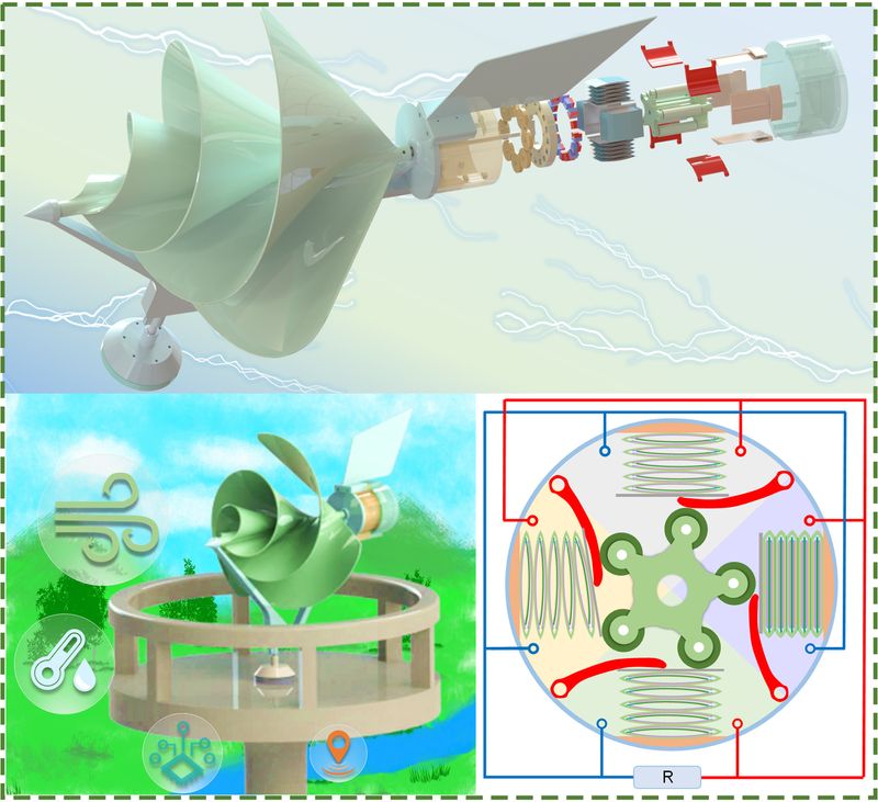 为了给分布式无线传感器网络(WSN)节点供电,用于微风能收集的摩擦纳米发电机(TENG)受到广泛关注。然而,多模块集成的TENG仍然面临着发电效率低、启动风速高、风向适应性差等挑战。本研究创新性地提出一种具有低启动风速的方向自适应摩擦电-电磁复合发电机(DA-TEHG),用于捕获全向微风能。开发了一种新型夹心式拱形TENG单元,具有接触-滑动-分离(CSS)工作模式和上变频机制,其表面电荷密度在10 Hz激励下达到传统拱形TENG的308.34%。集成阿基米德螺旋叶片(ASB)和风向标的捕风机构,结合转矩自调节机构,实现风向自适应并降低启动风速。通过集成具有Halbach永磁铁阵列的电磁发电机(EMG),进一步提升整体输出功率。研究了不同参数下系统的机械与电学特性并进行了优化。DA-TEHG在6 m/s风速下可输出177.26 mW功率,平均功率密度达184.39 W/m3。研究结果表明,其具备点亮LED和灯泡、为电容器充电、驱动无线传感系统及收集自然微风能的能力。总之,本工作展示出DA-TEHG作为自供电WSN节点分布式电源的潜力,在环境监测领域具有广阔的应用前景。